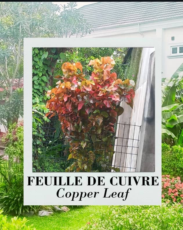 Le Copper Leaf (Acalypha wilkesiana) est un arbuste ou petit arbre tropical connu pour son feuillage frappant et coloré, allant du cuivre, bronze, rouge au vert. Il est couramment cultivé comme plante ornementale dans les jardins et les aménagements paysagers.